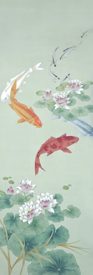Hand-painted silk wallpaper painting lotus with birds and fishes hand painted wall paper TV/Sofa/li
