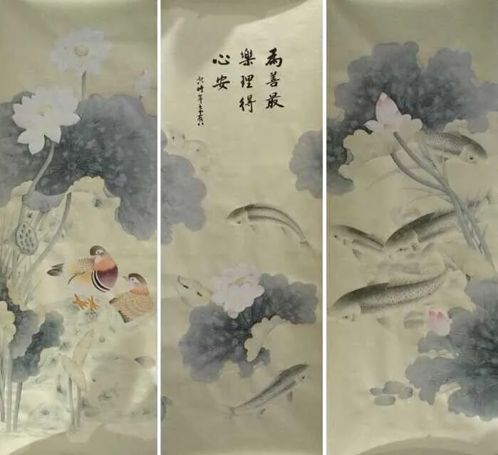 BEST QUALITY Hand-painted silk wallpaper painting lotus with birds and fishes hand painted wall paper TV/Sofa/li